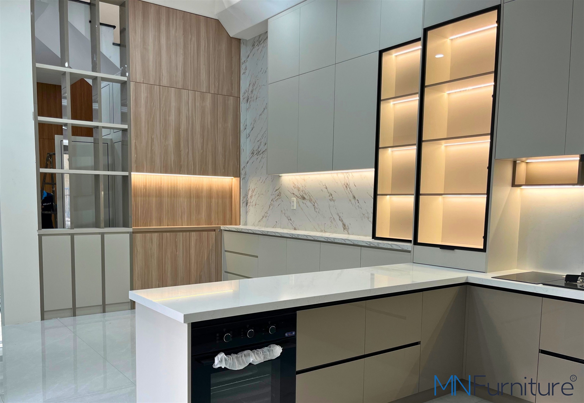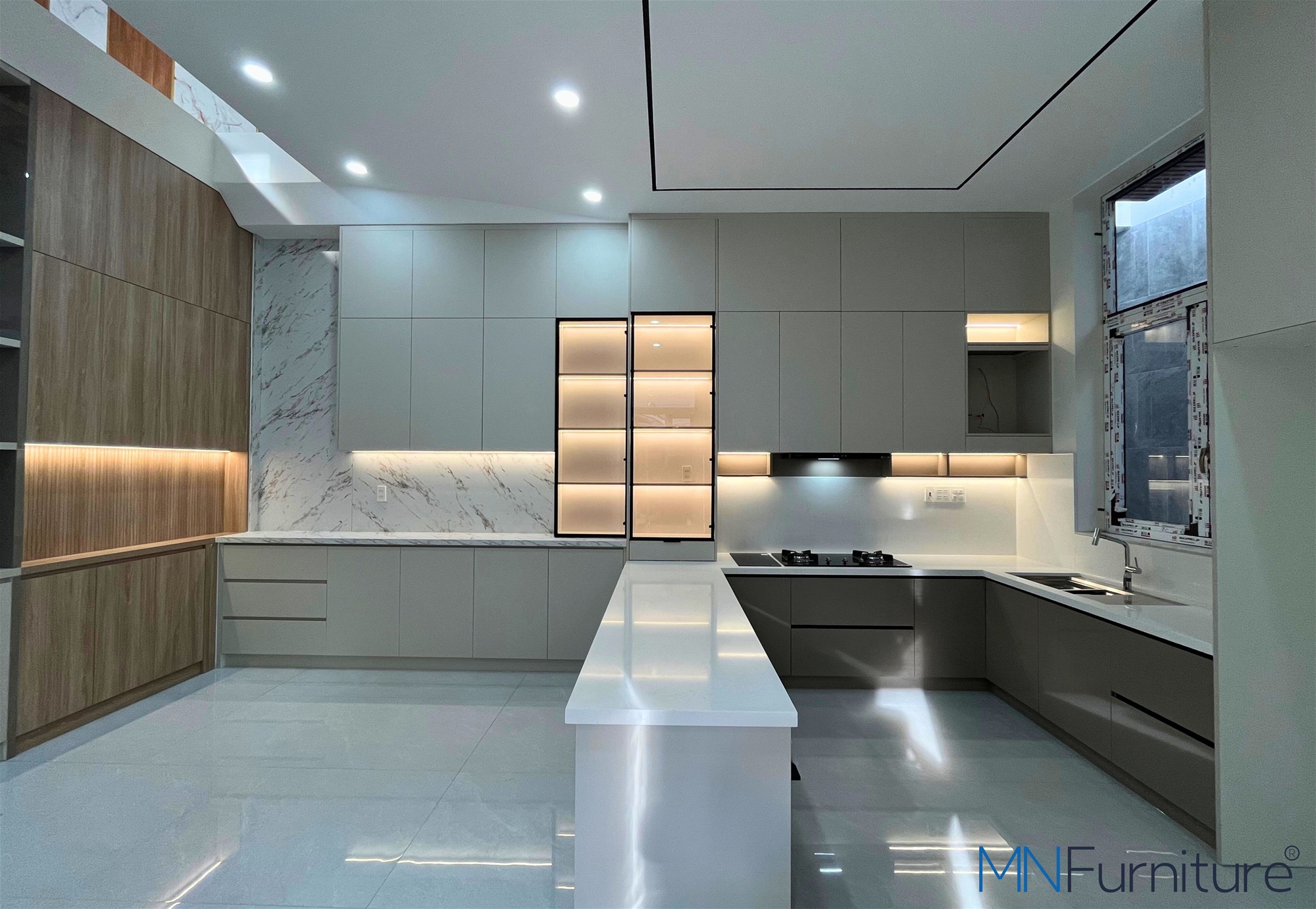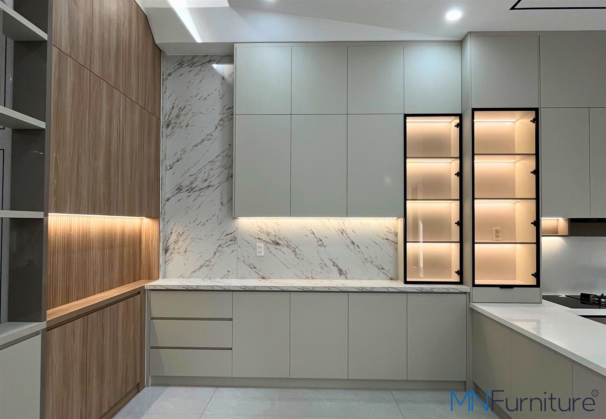 - Đá bếp: Vicostone - Đá nhân tạo gốc thạch anh, được sản xuất tại Việt Nam với công nghệ hiện đại hàng đầu thế giới, đạt tiêu chuẩn quốc tế. Có độ cứng cao, chống thấm, kháng khuẩn, chịu lực tốt, thân thiệt với môi trường.