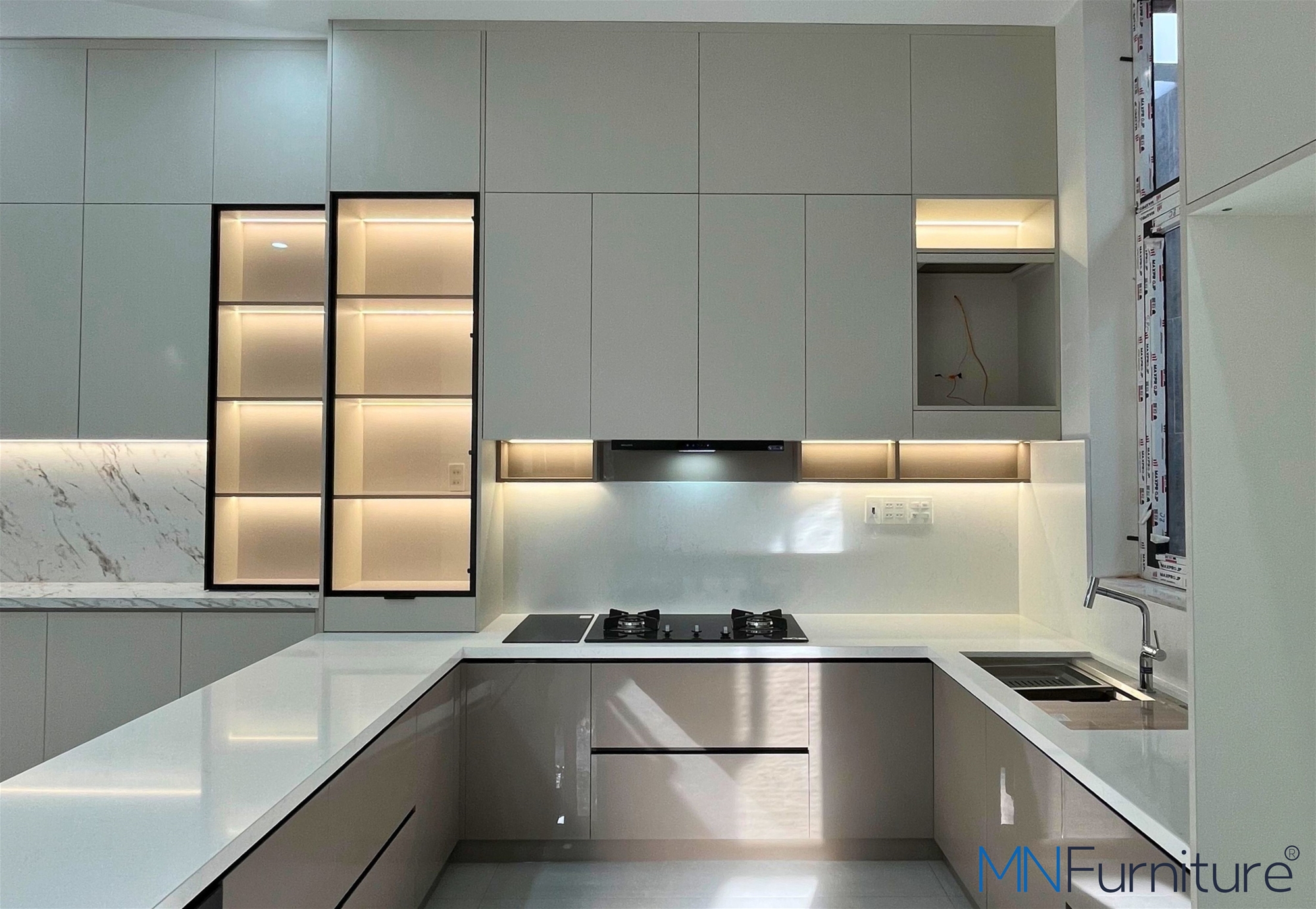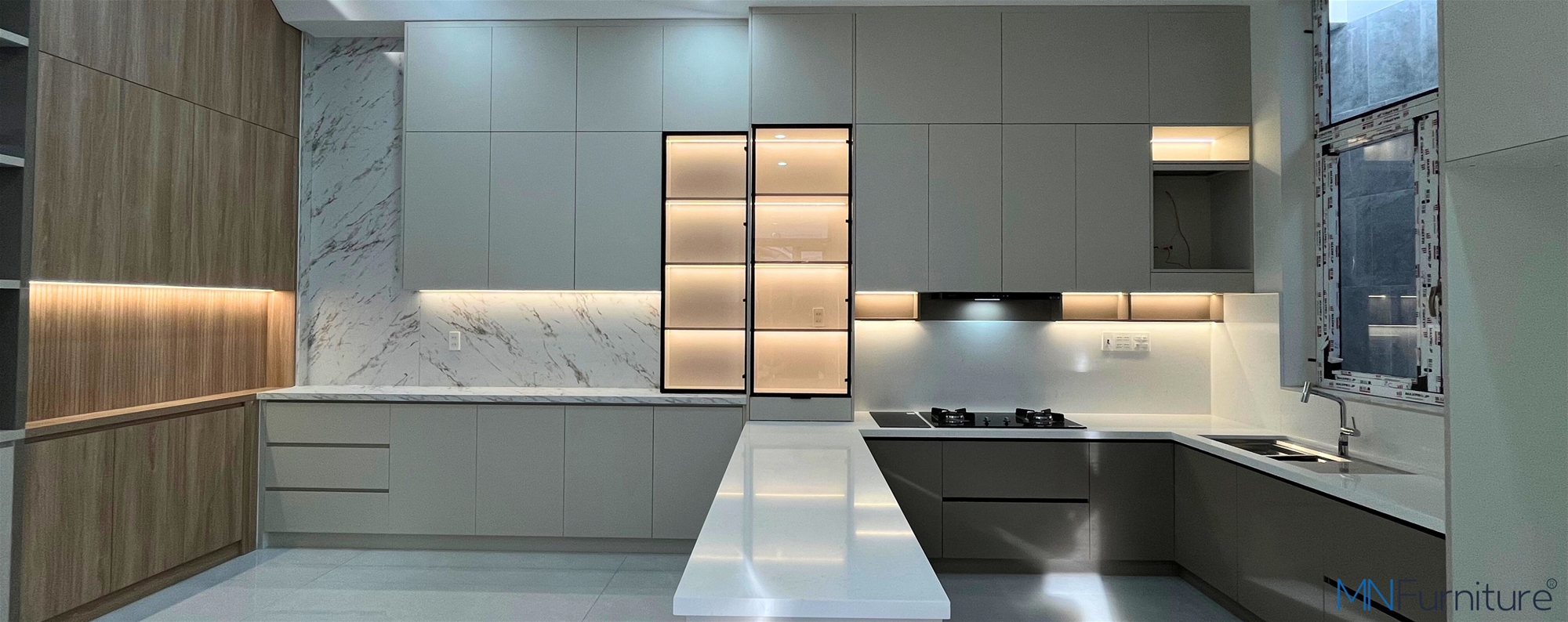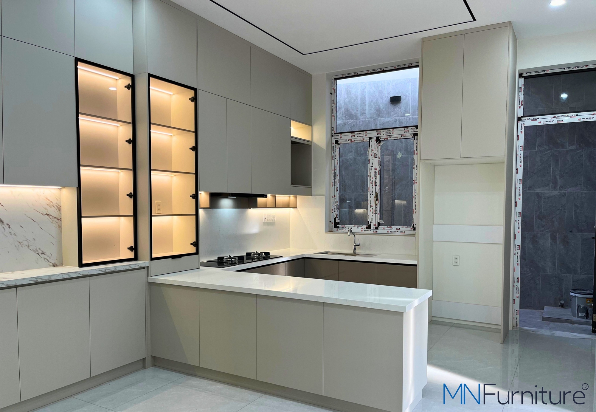 - Đá bếp: Vicostone - Đá nhân tạo gốc thạch anh, được sản xuất tại Việt Nam với công nghệ hiện đại hàng đầu thế giới, đạt tiêu chuẩn quốc tế. Có độ cứng cao, chống thấm, kháng khuẩn, chịu lực tốt, thân thiệt với môi trường.